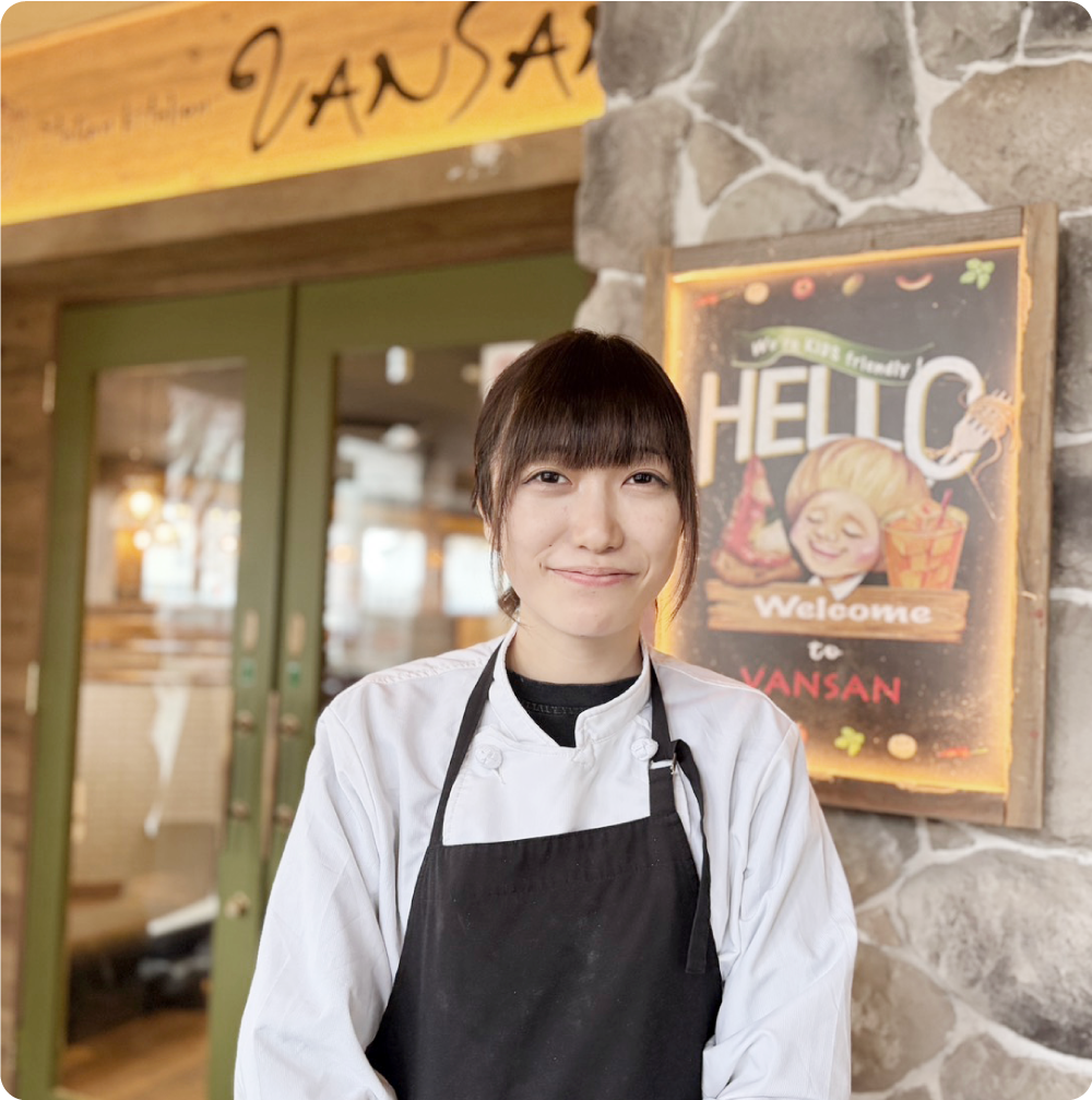 お客さまに「また来たい!」と思っていただけるような、地域に愛されるお店を目指して頑張っています。 東京や千葉での本部研修に参加する機会もいただき、多くのことを学ばせていただいています。私自身料理を作ることが好きなので、この仕事に携われることを嬉しく思っています。リーダーとして、忙しい時こそ前向きに声を掛け合い、スタッフみんなで笑顔で働ける環境づくりを大切にしていきます。